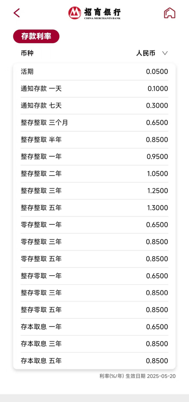 值得注意的是,除了国有大行,股份行方面招商银行于5月20日下调人民币存款利率,其中活期利率下调5个基点至0.05%;定期整存整取三个月期、半年期、一年期、二年期均下调15个基点,分别为0.65%、0.85%、0.95%、1.05%;定期整存整取三年期和五年期均下调25个基点,分别至1.25%和1.3%。定期零存整取、整存零取、存本取息三种期限均下跌15个基点。7天期通知存款利率下调15个基点至0.3%。