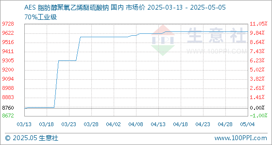 5月5日生意社AES脂肪醇聚氧乙烯醚硫酸钠基准价为9640.00元/吨