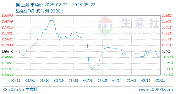 5月22日,生意社镍基准价为124658.33元/吨,与本月初(125175.00元/吨)相比,下降了-0.41%。