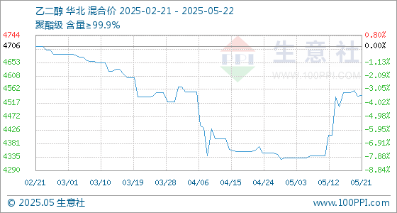 5月22日生意社乙二醇基准价为4543.33元/吨