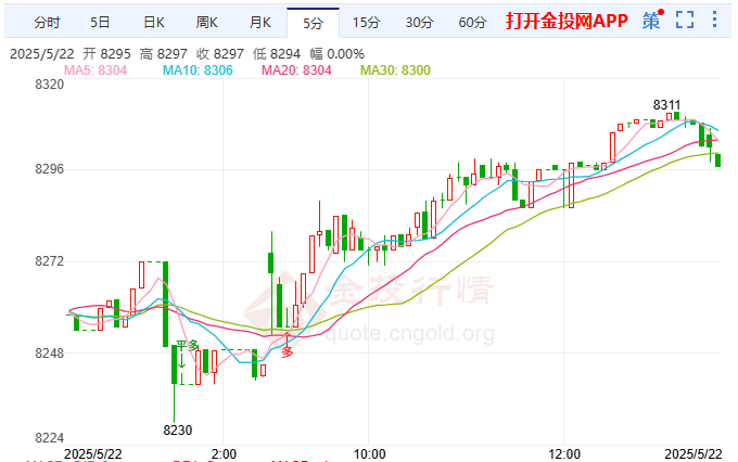 今日周四(5月22日)亚盘时段,白银t+d目前交投于8311一线上方,今日开盘于8223元/千克,截至发稿,白银t+d暂报8295元/千克,上涨1.17%,最高触及8311元/千克,最低下探8210元/千克,目前来看,白银t+d盘内短线偏向看涨走势。
