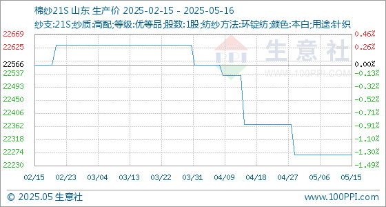 5月16日,生意社棉纱21S基准价为22266.67元/吨,与本月初持平。
