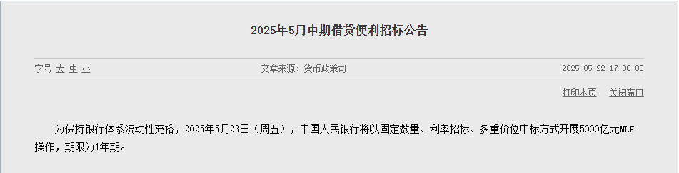 5月22日,央行公告,为保持银行体系流动性充裕,2025年5月23日(周五),中国人民银行将以固定数量、利率招标、多重价位中标方式开展5000亿元MLF操作,期限为1年期。