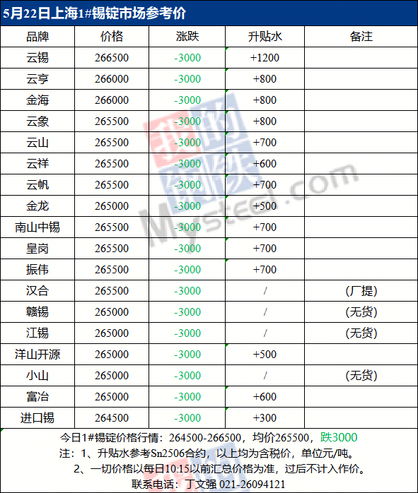 5月22日Mysteel上海现货锡锭报价264500-266500元/吨,均价265500元/吨,较上一交易日跌3000元/吨。Mysteel15:30上海现货锡锭成交价格254500-266500元/吨,均价265500元/吨,较上一交易日跌2750元/吨。