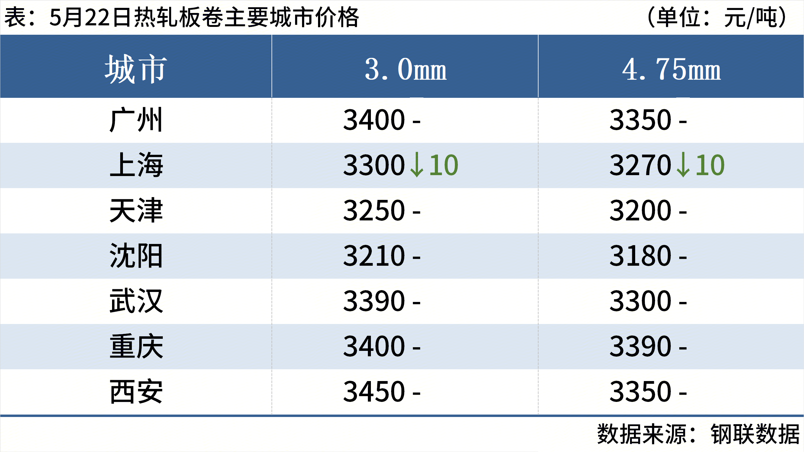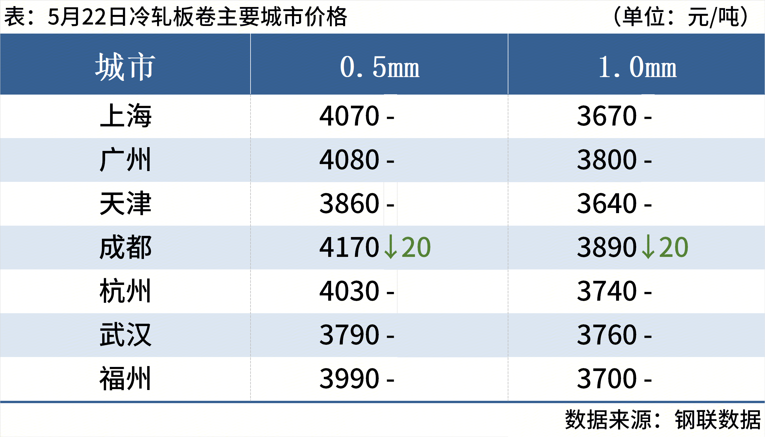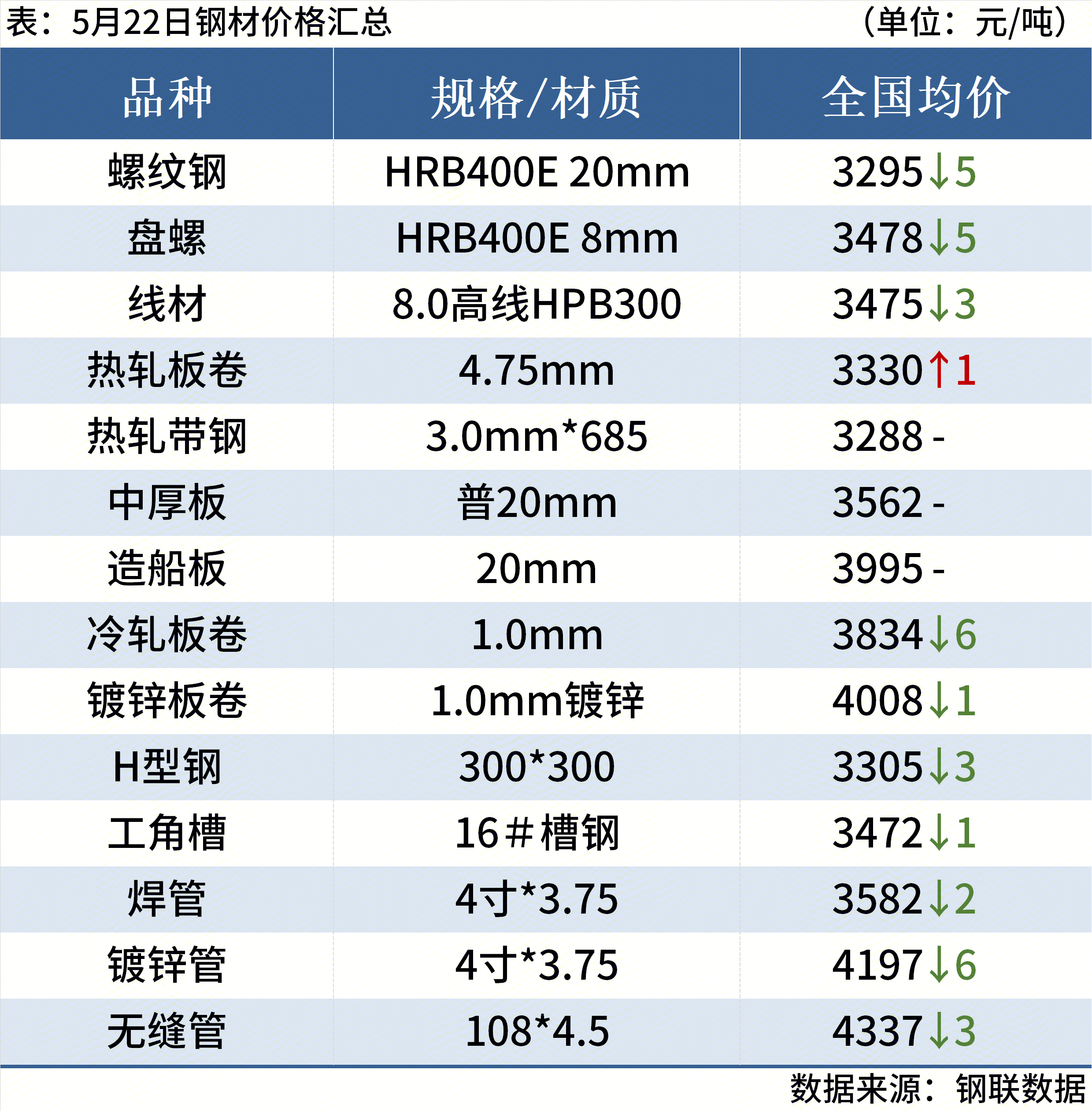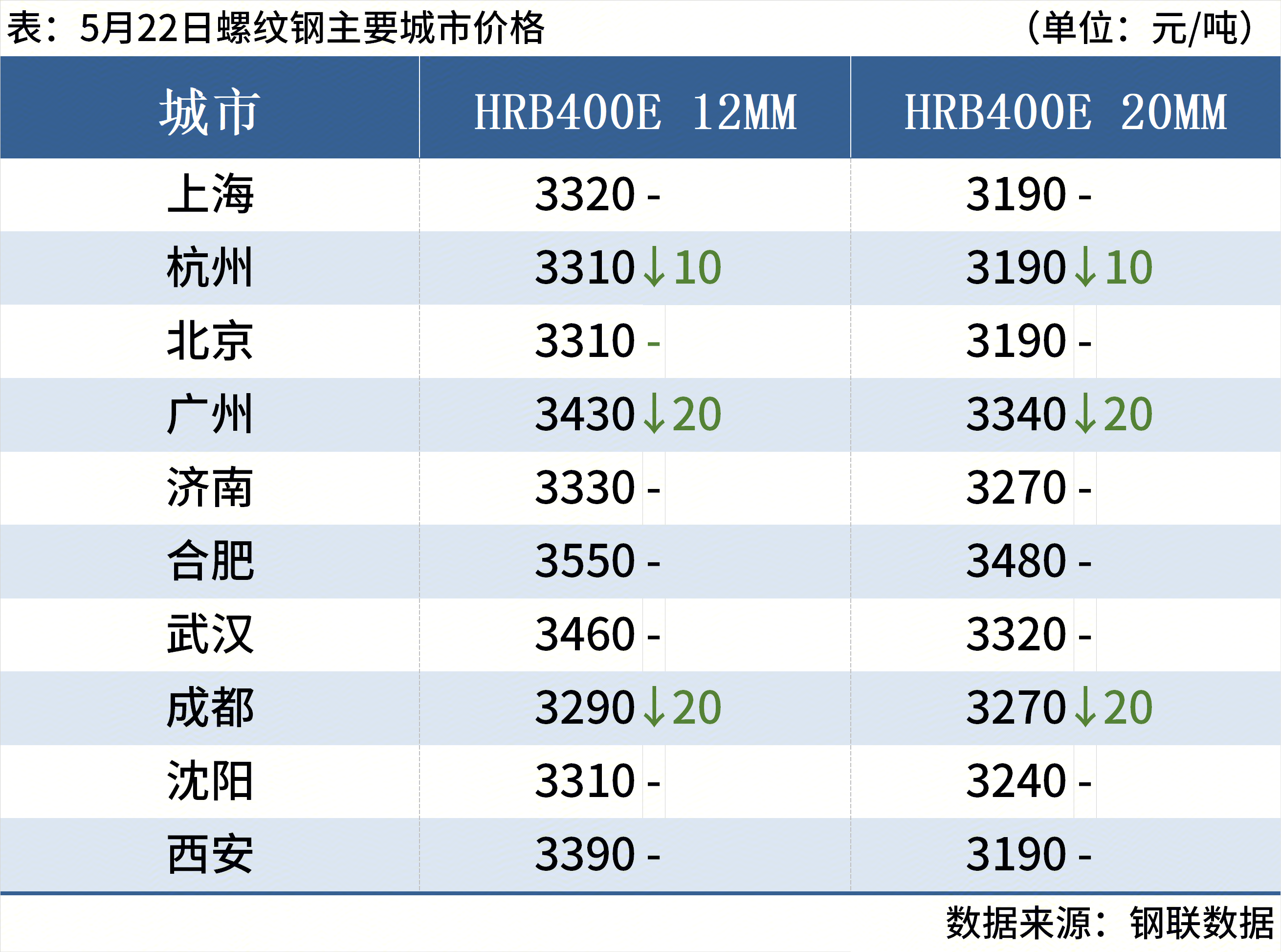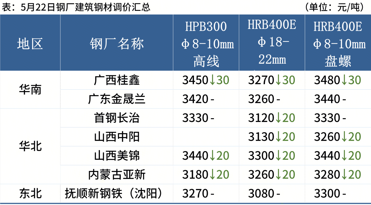 5月22日,国内5家钢厂下调建筑钢材出厂价20-30元/吨。