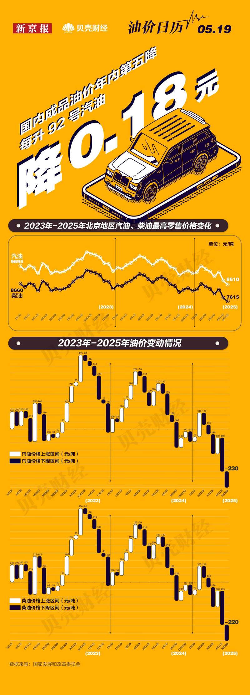 据国家发展改革委消息,5月19日24时起,国内成品油零售价格迎来今年第五次下调,国内汽、柴油价格(标准品)每吨分别降低230元和220元。折合成升价,每升92号汽油、95号汽油和0号柴油的降幅分别在0.18元、0.19元及0.19元。今年国内成品油零售价格已经历10轮调整周期,其中3次上调,2次搁浅,5次下调。北京地区汽油最高零售价8610元/吨,柴油7615元/吨。
