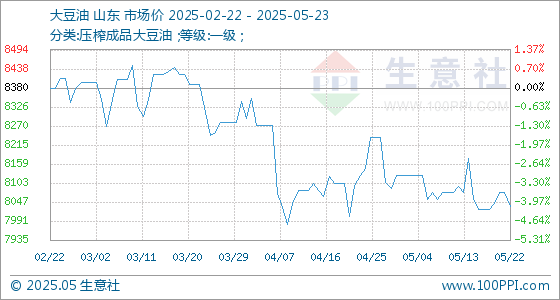 5月23日,生意社大豆油基准价为8034.00元/吨,与本月初(8126.00元/吨)相比,下降了-1.13%。