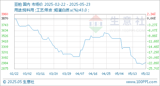 5月23日,生意社豆粕基准价为2998.00元/吨,与本月初(3476.67元/吨)相比,下降了-13.77%。