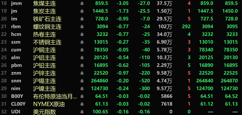 黑色系均飘绿,铁矿跌0.95%,不锈钢跌0.27%。螺纹和热卷均跌0.77%。双焦方面:焦煤跌3.05%,焦炭跌1.73%。