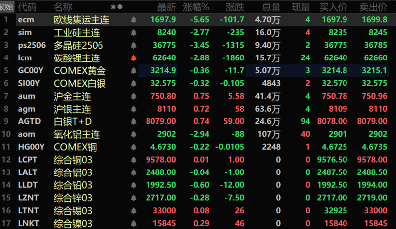 此外,氧化铝跌2.94%。碳酸锂跌2.88%,工业硅跌2.77%,多晶硅跌3.45%。