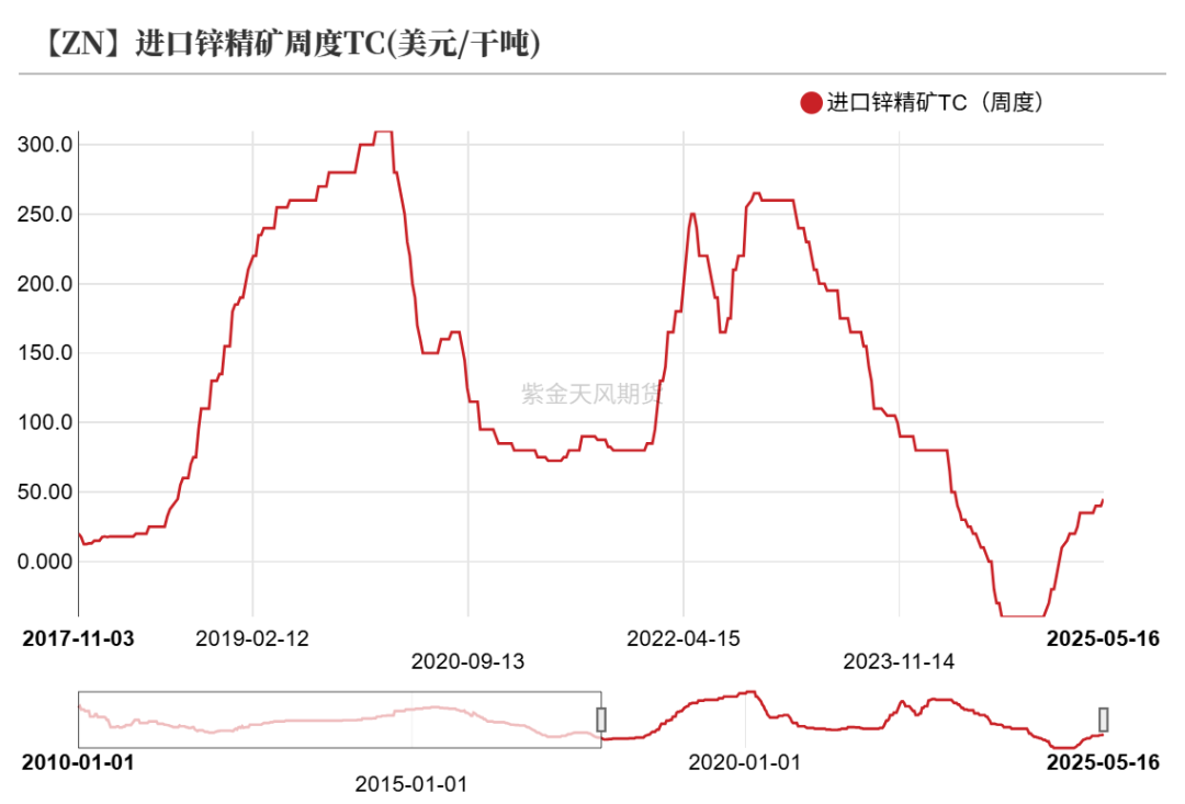 进口锌精矿加工费运行于40-50美元/干吨之间,均价45美元/干吨,环比小涨。