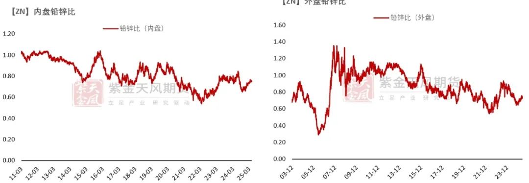铅锌比价小幅上扬,截至本周三内盘铅锌比为0.75,外盘铅锌比0.73。