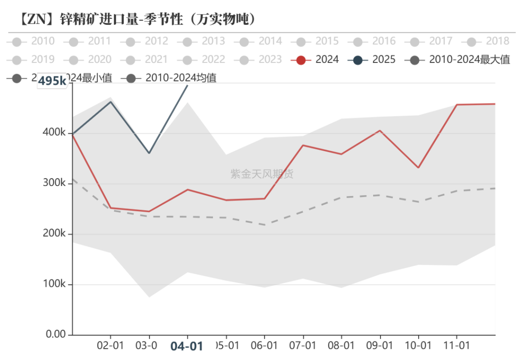 海关数据,2025年3月锌矿砂及其精矿进口量35.95万吨,环比增加22.09%;3月进口量环比减量明显,主要因年初部分抢进口行情导致1-2月进口矿激增,3月炼厂正常长单进口货源流入。