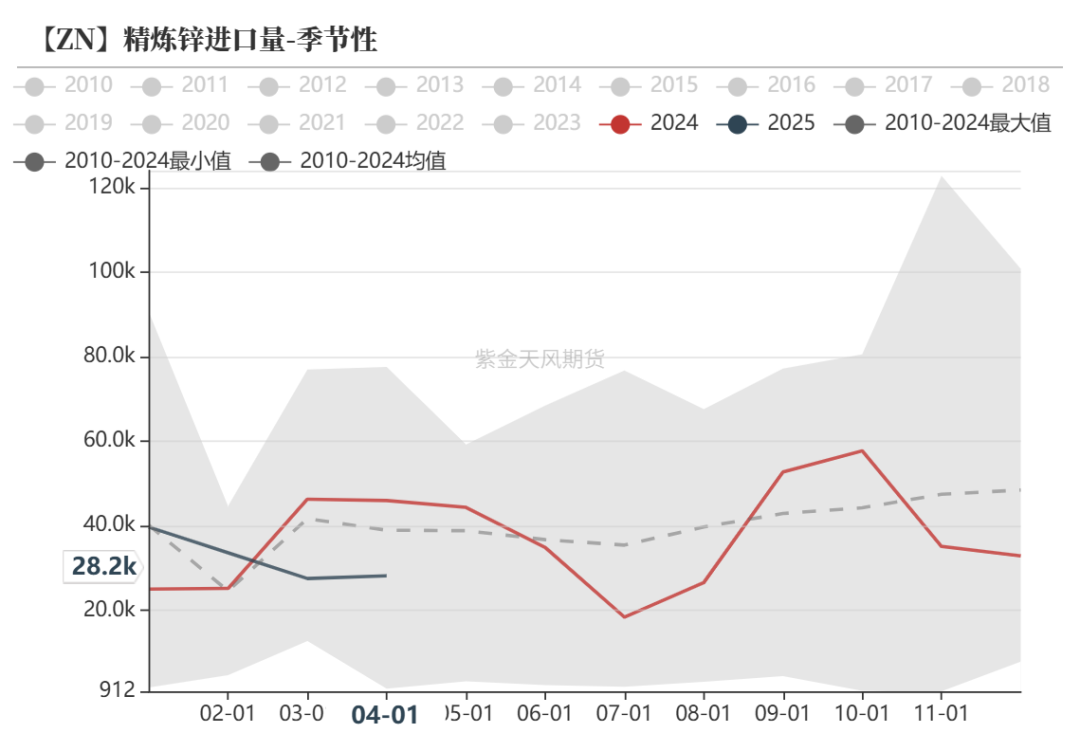 海关数据显示,2025年3月中国进口精炼锌2.76万吨,同比减少40.50%;