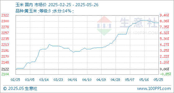 5月26日,生意社玉米基准价为2295.71元/吨,与本月初(2252.86元/吨)相比,上涨了1.90%。