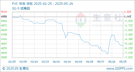 5月26日,生意社PVC基准价为4681.00元/吨,与本月初(4679.00元/吨)相比,上涨了0.04%。
