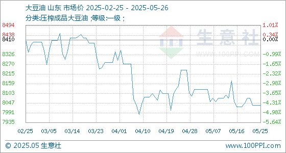5月26日,生意社大豆油基准价为8034.00元/吨,与本月初(8126.00元/吨)相比,下降了-1.13%。