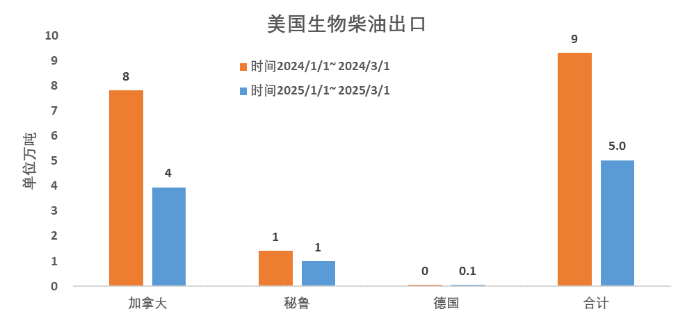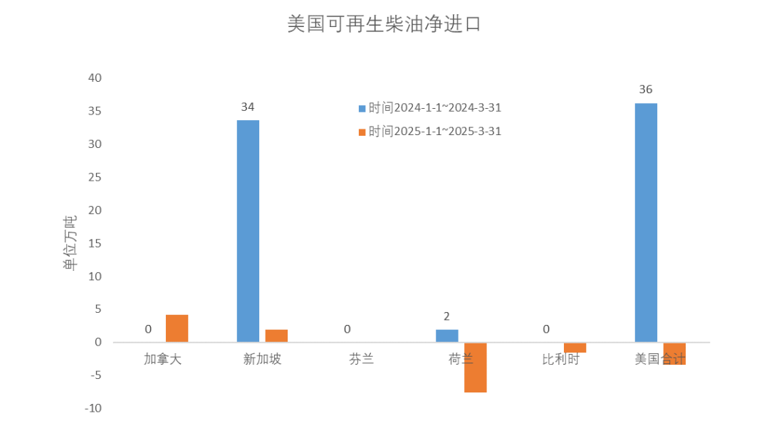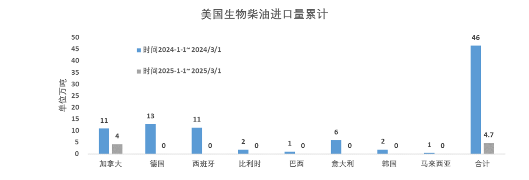 2025年1-3月份,美国生物柴油出口量出现大幅的下降,合计出口量为5万吨,累计同比下降46%。美国生柴主要出口国是加拿大,2025年1季度与加拿大贸易量减半。