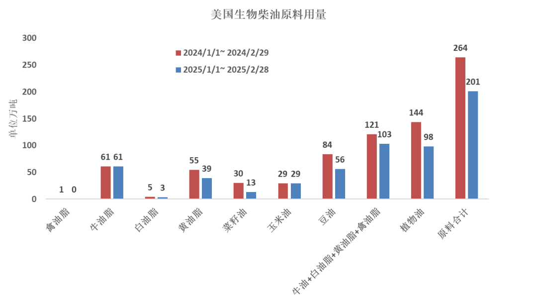 2025年1-2月份,美国生物质柴油原料总用量是201万吨,去年同期为264万吨,累计同比下降63万吨,减幅为23.9%。