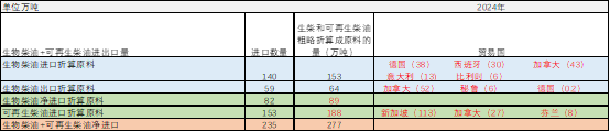 2、2024年美国可再生柴油主要是进口,没有出口,进口量为153万吨。主要的贸易国家是新加坡、加拿大、和芬兰。