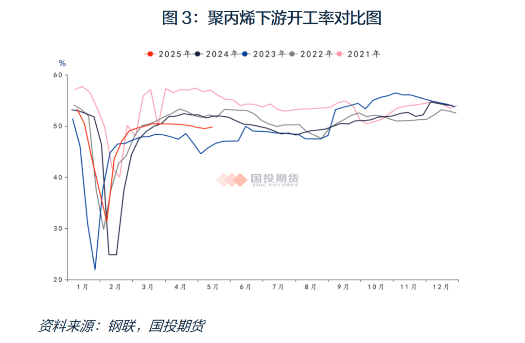 今年春节以后聚丙烯下游开工恢复较快,但后继乏力。4月份是PP传统旺季,但消费复苏明显不及预期,进入4月份以后,内需不振,加之关税政策带来的贸易争端骤然加剧,外需承压。PP主要下游领域开工负荷不升反降,整体呈现高位回落态势。中上旬PP下游塑编、注塑以后BOPP等领域受前期订单支撑,整体开工水平仍处在较高水平。但部分塑编、注塑企业出口订单受中美贸易商影响有所减少,开工负荷随之下滑,加之后期逐渐进入季节性淡季,下游工厂对后市需求信心偏弱,入市采购意愿不足,PP需求难以持续释放,对PP市场驱动力度偏弱。