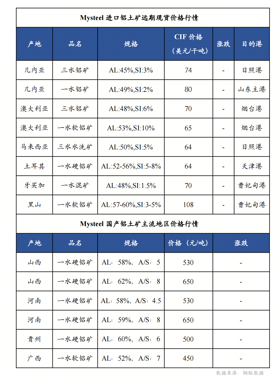 1月6日国产铝土矿价格平稳运行。国产矿山维持常态开工,采暖季环保压力增加,下游氧化铝企业国产矿库存始低位,现货难寻支撑国产矿现货报价坚挺。 进口矿方面价格高位平稳运行。几内亚发运恢复,梅特罗雨季将影响至2025年2月,期间发运量减少。