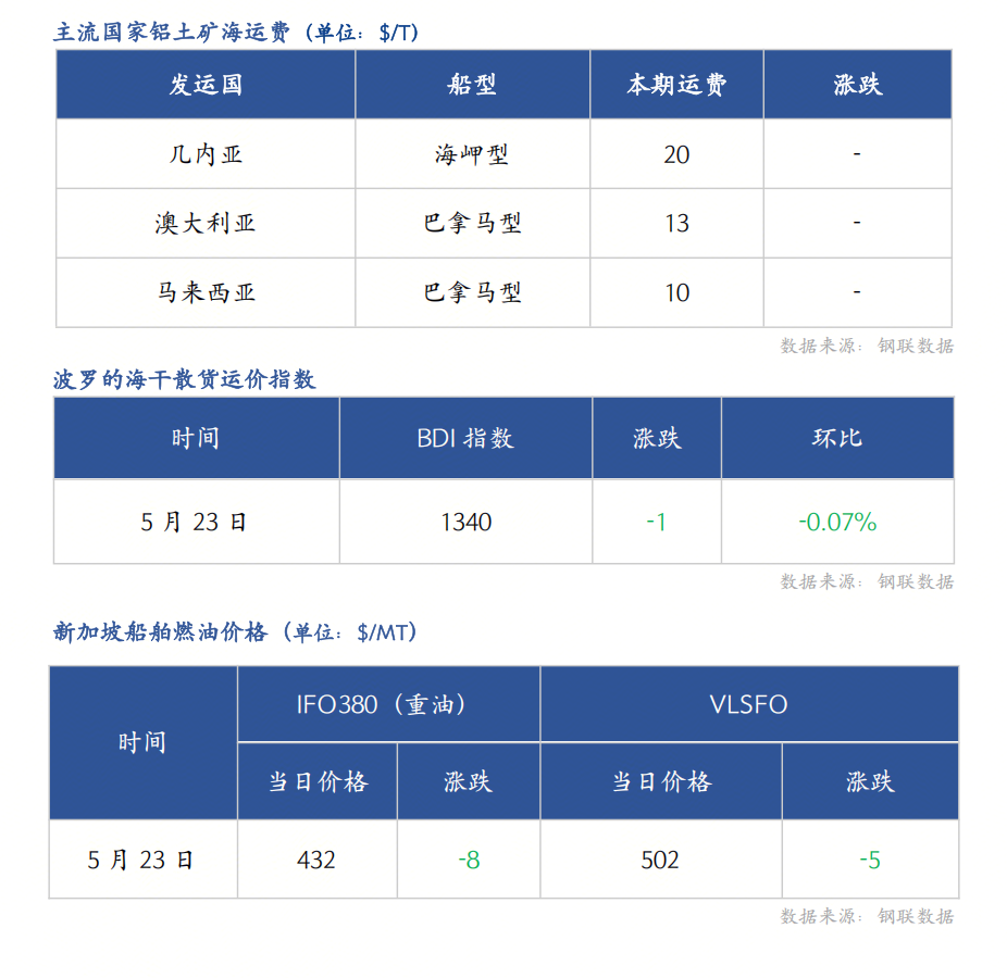 5月26日铝土矿价格总体持稳,海运费总体呈下跌趋势。
