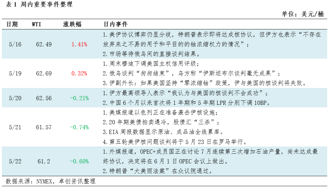 截至5月22日当周(5.16-5.22),国际油价周均价小幅下行,WTI主力合约结算价周均价62.1美元/桶,环比下跌0.29%;Brent主力合约结算价周均价65.14美元/桶,下跌0.13%。周内国际油价受多方因素交织扰动,日内高波动,整体震荡调整。地缘层面由上一周的存降温预期,演化至博弈期间的僵持阶段,且美媒报道中东存升温风险。但地缘带来的涨势不显,油价呈现承压运行,偏弱发展态势。一方面,穆迪下调美国主权信用评级、20年美债拍卖遇冷、美国股债汇“三杀”,美债风险使宏观情绪承压;另一方面,临近6月OPEC会议,进一步加速增产预期再起,抑制供需情绪。下周国际油价风险加剧,周均价将进一步下行,关注地缘与供应端风险。