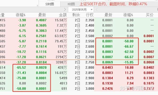 我们看下图是上证50ETF合约的T形报价,截图时间,上证50ETF涨幅是0.47%,认购期权和认沽期权的虚值合约都是下跌的。