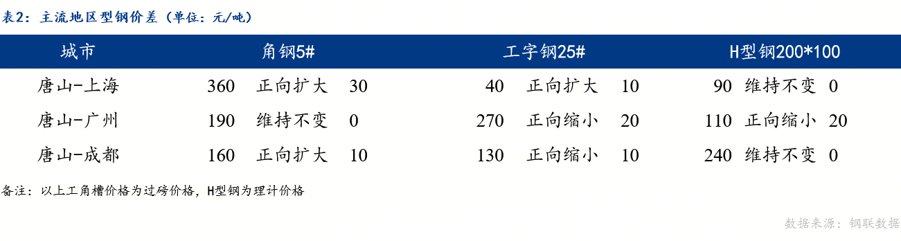 从区域价差来看,唐山与上海角钢、工字钢价差正向扩大,与H型钢价差维持不变;唐山与广州工字钢、H型钢价差正向缩小,与角钢价差维持不变;唐山与成都角钢价差正向扩大,工字钢价差正向缩小,H型钢价差维持不变。