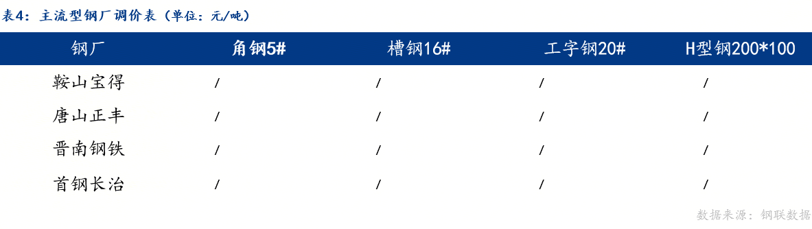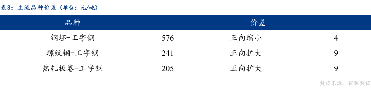 从品种价差来看,工字钢与螺纹、热卷价差正向扩大,与钢坯价差正向缩小。