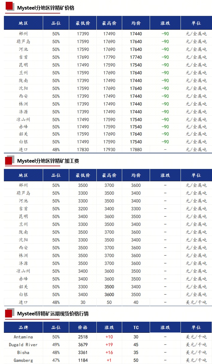 西北地区:甘肃某锌锭生产企业50品位的锌精矿加工费3400元/金属吨到厂。