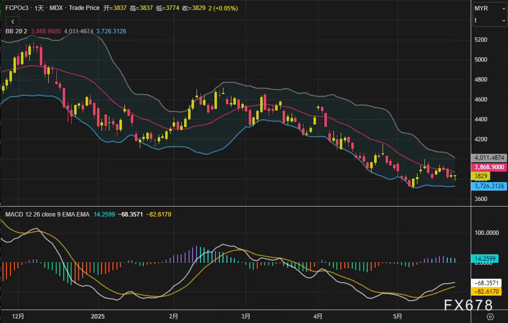 汇通财经APP讯——周一(5月26日),马来西亚衍生品交易所(BMD)棕榈油期货呈现窄幅震荡走势。基准8月合约FCPOc3微涨2林吉特(0.05%),收报每吨3829林吉特(约合908.42美元)。盘面显示,布林带(20,2)上轨4011林吉特、中轨3869林吉特、下轨3726林吉特形成明确价格通道,MACD指标虽仍处负值区域(-82.6),但快慢线间距收窄至14.2,暗示市场正在寻找新的方向。