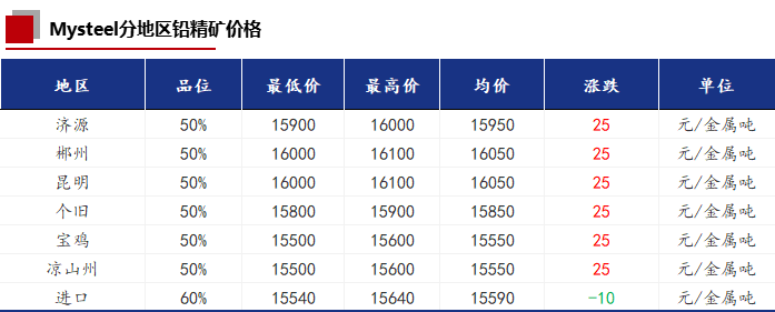 今日国内铅精矿加工费各地区均未调整,和上一交易日持平。受铅价的影响,铅精矿价格较上一交易日涨25元/金属吨。进口铅精矿价格下降10元/金属吨。