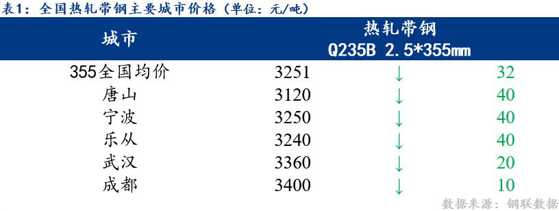 26日热轧带钢全国主要城市价格震荡下行,截至发稿时2.5*355mm热轧带钢均价3251元/吨,较上周五下跌32元/吨,其中2.5*355mm主要城市报价为唐山3120元/吨,宁波3250元/吨,乐从3240元/吨。
