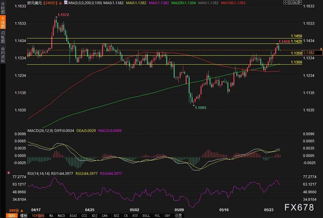 汇通财经APP讯——周一(5月26日),欧元兑美元延续上周五的反弹势头,亚欧时段一度触及1.1421,创一个月新高,随后小幅回落至1.1377附近,日内涨幅0.12%。美元指数则延续疲软走势,跌至98.921,接近一个月低点。市场情绪改善主要得益于特朗普推迟对欧盟加征50%关税的决定,但政策不确定性仍限制欧元的进一步上行。