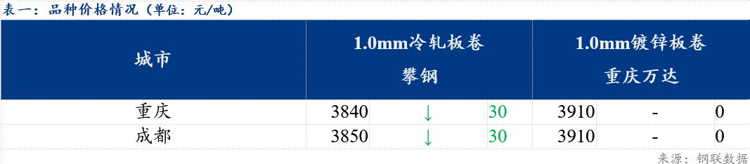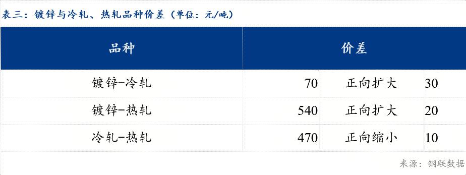 重庆、上海地区冷轧板卷区域价差维持不变;重庆、广州冷轧板卷区域价差扩大20元/吨。重庆、上海镀锌板卷区域价差扩大50元/吨;重庆、广州镀锌板卷区域价差扩大30元/吨。镀锌、冷轧品种价差扩大30元/吨;镀锌、热轧品种价差扩大20元/吨 ;冷轧、热轧品种价差缩小10元/吨。