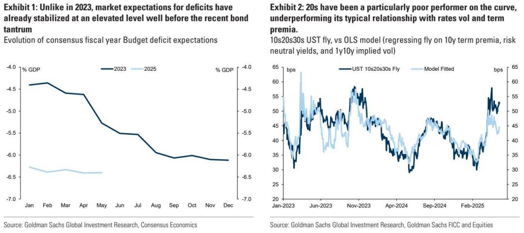 为未来提供反馈。上周五穆迪的信用评级下调、财政方案在美国国会的推进情况以及全球的溢出效应共同作用,进一步强化了人们对财政风险的密切关注。与 2023 年的经历相比,其相似之处包括对政策降息的信念逐渐减弱、财政问题的隐忧(因美国评级下调而加剧)以及来自日本的看跌情绪。然而,高盛认为此次美国国债面临的风险更多源于在全球对美国资产需求减弱的情况下,缺乏稳定整体财政轨迹的动力,而非对赤字规模或发行构成的突然担忧(这些在 2023 年发挥了更明显的作用)。
