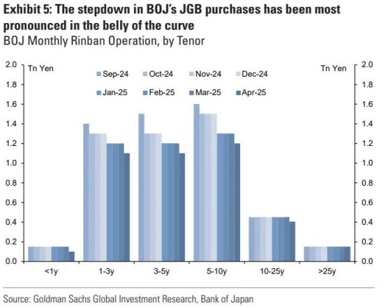 到目前为止,日本国债收益率上升对全球市场的溢出效应较为有限,但在当前财政担忧引发对长期利率供应的担忧的全球背景下,如果这种走势持续下去,以外汇对冲为基础的日本国债相对于其他资产的相对吸引力可能会对全球利率产生溢出风险。此次下跌的一个潜在止损点可能是通过减少长期供应来实现(例如,如果日本财务省决定改变发行计划),但这可能需要时间。另一种可能性是日本央行在量化宽松政策方面采取更温和的立场(可能与对政策利率采取更紧缩的立场相结合)。但就后者而言,高盛注意到,目前 “rinban”(日本央行用于管理收益率曲线的购债操作)的大幅减仓主要来自曲线的腹部,而日本央行在曲线长端的参与程度并未发生实质性的变化。