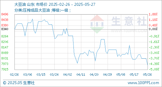 5月27日,生意社大豆油基准价为7964.00元/吨,与本月初(8126.00元/吨)相比,下降了-1.99%。