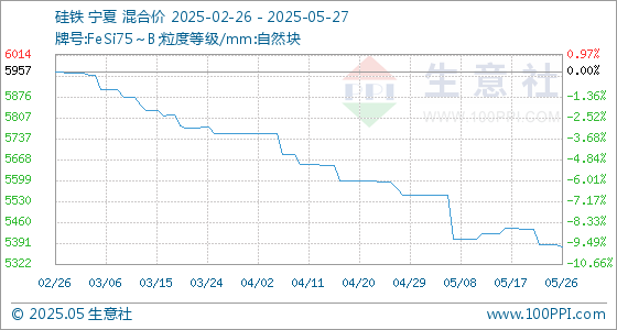 5月27日,生意社硅铁基准价为5380.00元/吨,与本月初(5548.57元/吨)相比,下降了-3.04%。