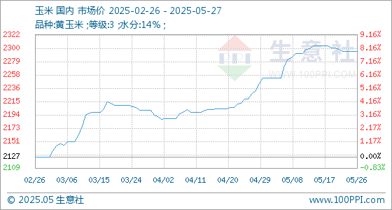 5月27日,生意社玉米基准价为2295.71元/吨,与本月初(2252.86元/吨)相比,上涨了1.90%。