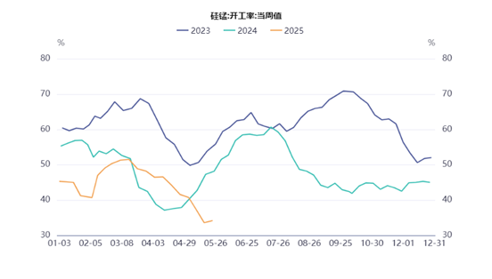 供应端来看,Mysteel调研的187家硅锰生产企业3月以来新增检修及停产36家,矿热炉数49台,合计日均产量产量减少7100吨;贵州、云南等地因成本倒挂问题,减产幅度超6%,而内蒙古等西北产区因长协订单支撑,开工率相对稳定。截至2025年5月23日当周,全国187家独立锰硅企业开工率降至33.6%,日均产量23250吨,处于年内新低,开工率较同期下降14%;在产企业数量缩减至76家,较前期减少15.56%。锰硅减产主要原因在于钢招价格持续下行,需求端,钢材需求表现低迷,金三银四表现尚未达到市场预期,且粗钢压减共识较强,对硅锰需求仍存在较大抑制。当下钢材需求转入淡季,铁水产量高位回落,硅锰需求预计小幅走弱。厂家端,内蒙古部分厂家本周检修后复产,云南地区即将进入丰水期,个别工厂月底有开炉计划,另有部分停产工厂将在7月份电费降到低位时复产。
