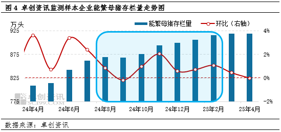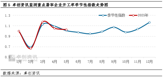 从需求来看,屠宰变化情况具有明显的季节性走势。根据卓创资讯监测的过去9年重点屠宰企业开工率,2025年1-5月份屠宰企业开工率变化指数与季节性指数吻合度高,未来三个月的屠宰开工率变化趋势亦或趋同,呈现先降后增态势。