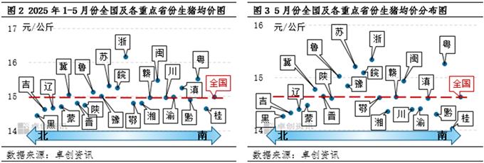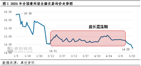 根据卓创资讯监测,今年生猪市场行情呈高位震荡下滑、盘整、下滑走势。截至5月23日,2025年瘦肉型生猪交易均价14.98元/公斤,同比上涨0.25元/公斤,涨幅1.69%。其中,盘整周期自2月中旬开始一直到5月上半月,长达三个月;此阶段生猪均价为14.81元/公斤,与最高点15.09元/公斤相比相差0.28元/公斤,与最低点14.63元/公斤相比相差0.18元/公斤,相差幅度均较小。5月下半月,市场行情打破震荡周期,猪价跌至5月23日的14.28元/公斤,成为截至目前的全年最低价,在此之前,最低价为2月11日的14.51元/公斤。