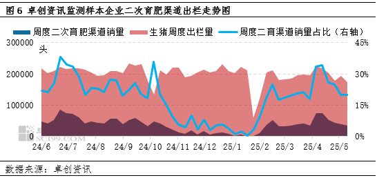 近期受关注的二次育肥,其热度则在5月份有所消退。根据卓创资讯监测,截至5月上半月,二次育肥补栏量与4月高峰相比累计下滑53.94%。二次育肥补栏量减少,对行情的影响度减弱,市场仍需关注供需基本面的变化。