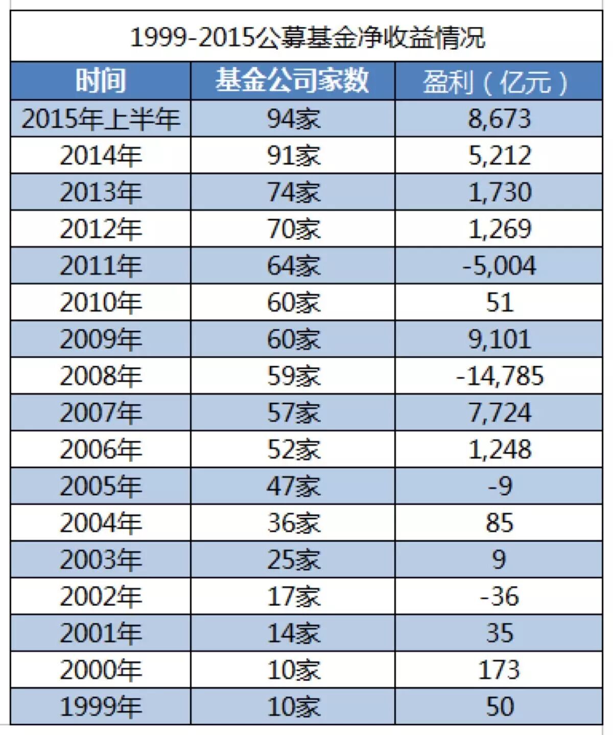 1999年,只有十家左右的基金公司,十几只基金产品,管理资产规模100亿元左右。而截至2015年下半年,中国一共有104家基金公司,3500多只基金,1183名基金经理。