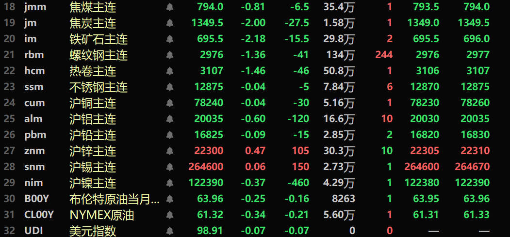 黑色系均飘绿,铁矿跌2.18%,热卷跌1.46%。不锈钢微跌,螺纹跌1.36%。双焦方面:焦煤跌0.81%,焦炭跌2%。