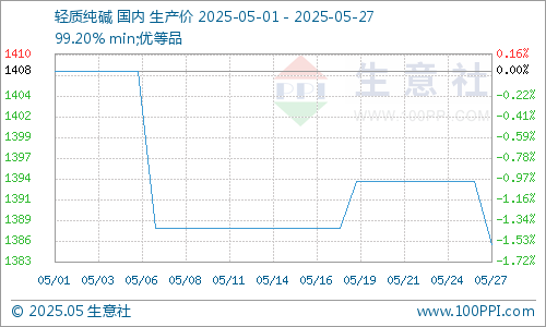 据生意社商品分析系统显示,5月27日轻质纯碱价格下调,市场均价在1386元/吨,与上一交易日价格1394元/吨相比下调0.57%,较月初跌幅1.56%。