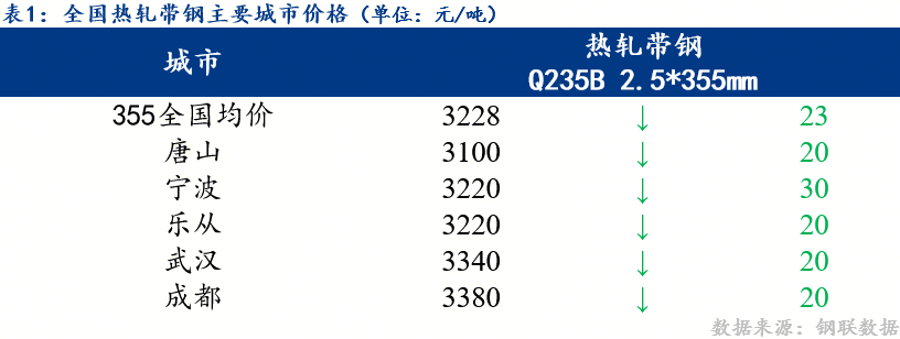 27日热轧带钢全国主要城市价格震荡下行,截至发稿时2.5*355mm热轧带钢均价3228元/吨,较昨下跌23元/吨,其中2.5*355mm主要城市报价为唐山3100元/吨,宁波3220元/吨,乐从3220元/吨。